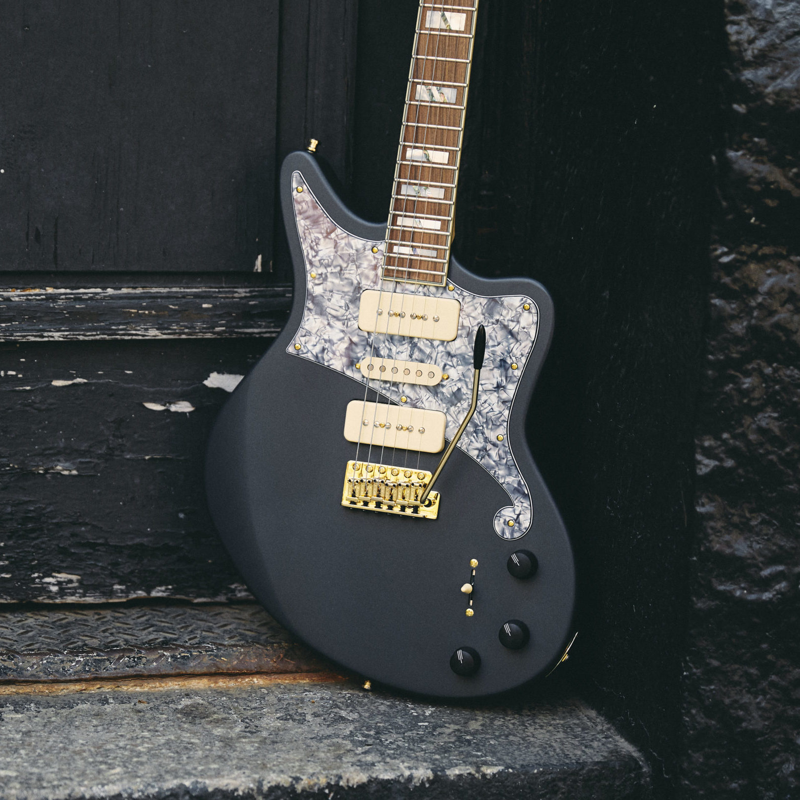 A Matte Stone finish, custom Black Pearl f-hole pickguard, and gold hardware draw you in rather than demand your attention.